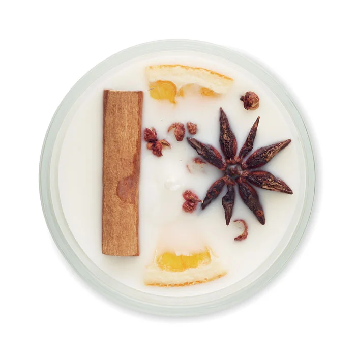 Небольшая восковая свеча на растительной основе с ароматом корицы и цитрусовых, с засушенными цветами и фруктами в стеклянном стаканчике. 85 гр. Время горения: 14 часов.